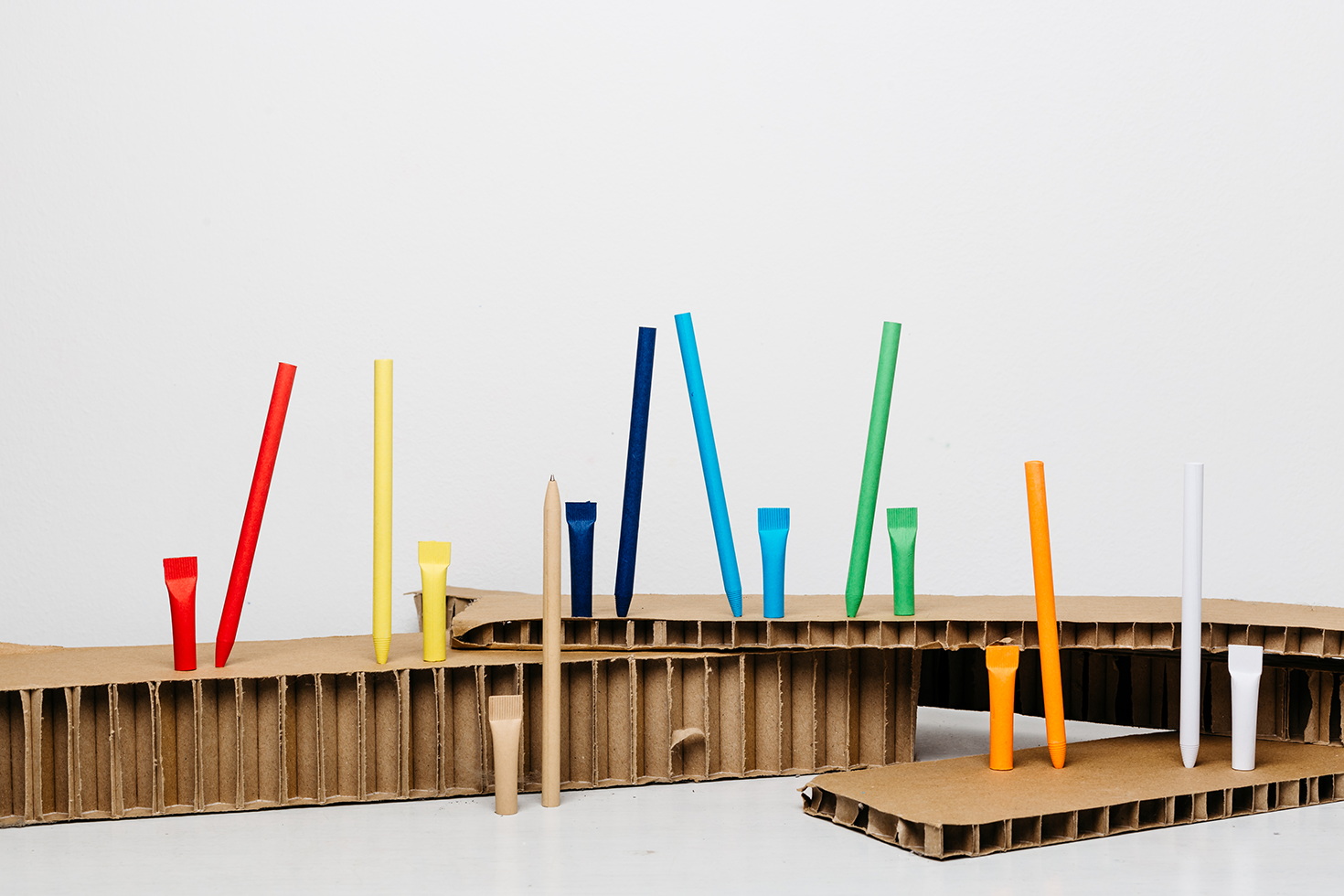 Paper ball pen with cap, all parts matching color. Dimension: O 0.8 x 14 cm.